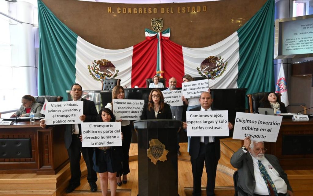 Cd. Juarez, CHIH.- Morena protesta por las condiciones del transporte público en Juárez y la falta de cumplimiento histórico de los concesionarios en cuanto al estado físico de los camiones y calidad del servicio, sobre todo porque les concedieron las condiciones del aumento de tarifa. Los legisladores tomaron la tribuna con pancartas que contenían leyendas como “Camiones viejos, esperas largas…