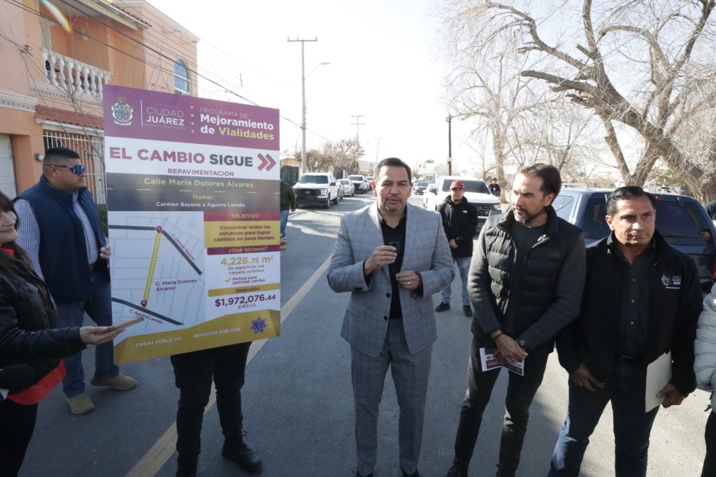 Cd. Juarez, Chih.- El Presidente Municipal, Cruz Pérez Cuéllar, entregó este día la pavimentación de la calle María Dolores Álvarez, en el fraccionamiento San Ángel, la cuarta vialidad rehabilitada con recursos del programa del Presupuesto Participativo 2023. El alcalde entregó a los vecinos esta calle que contempló una inversión de casi dos millones de pesos, con más de 4 mil…