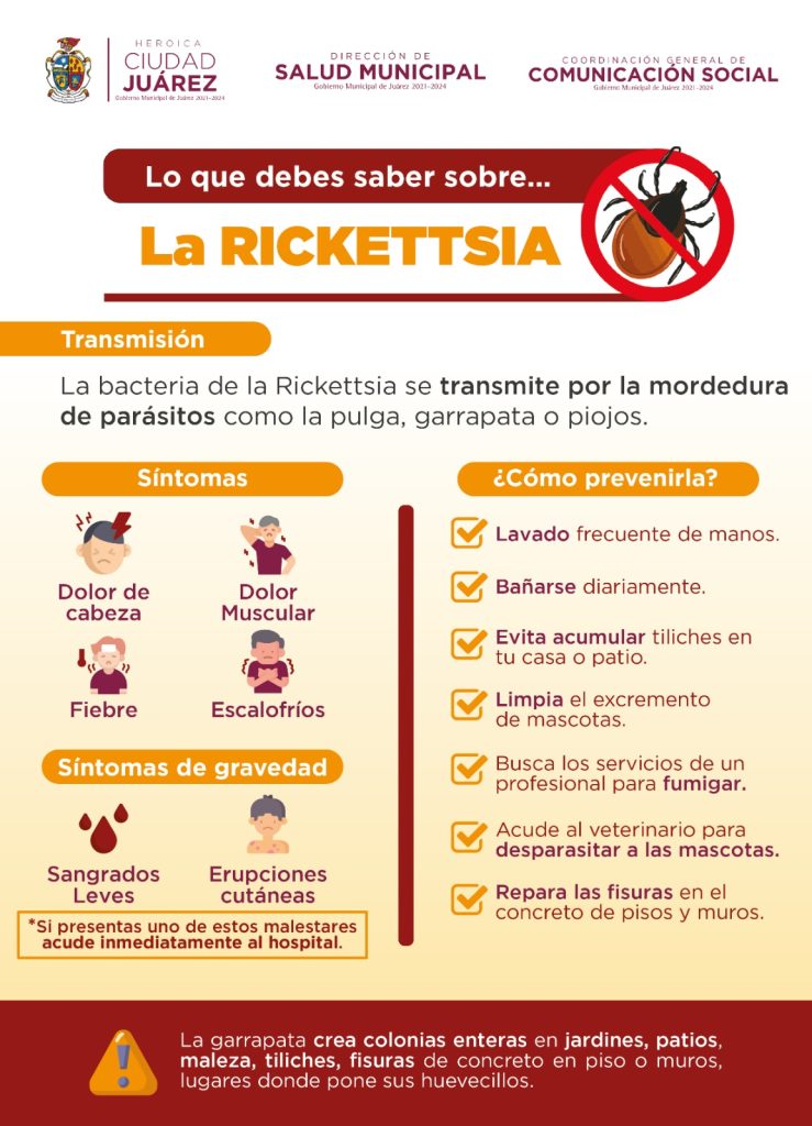 Cd. Juarez, Chih.- Con el fin de que la ciudadanía conozca información relevante sobre la Rickettsia, el Gobierno Municipal a través de la Dirección de Salud Municipal y la Coordinación General de Comunicación Social, emite cuáles son los síntomas más comunes y cómo prevenirla. La Rickettsia es una enfermedad transmitida por la mordedura de pulgas, piojos o garrapatas infectadas con…